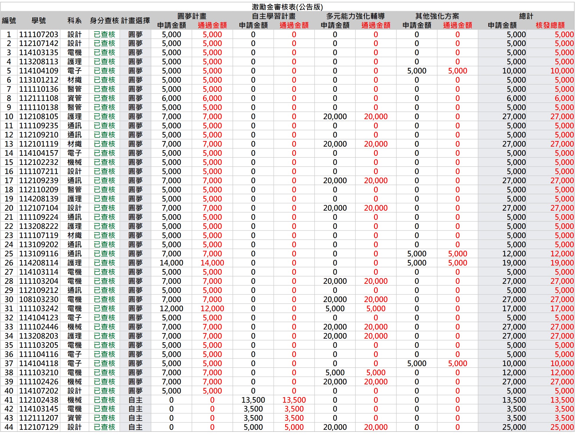 115年完善計畫,1月份學習激勵金通過名單如下表,核發明細詳見公告。
