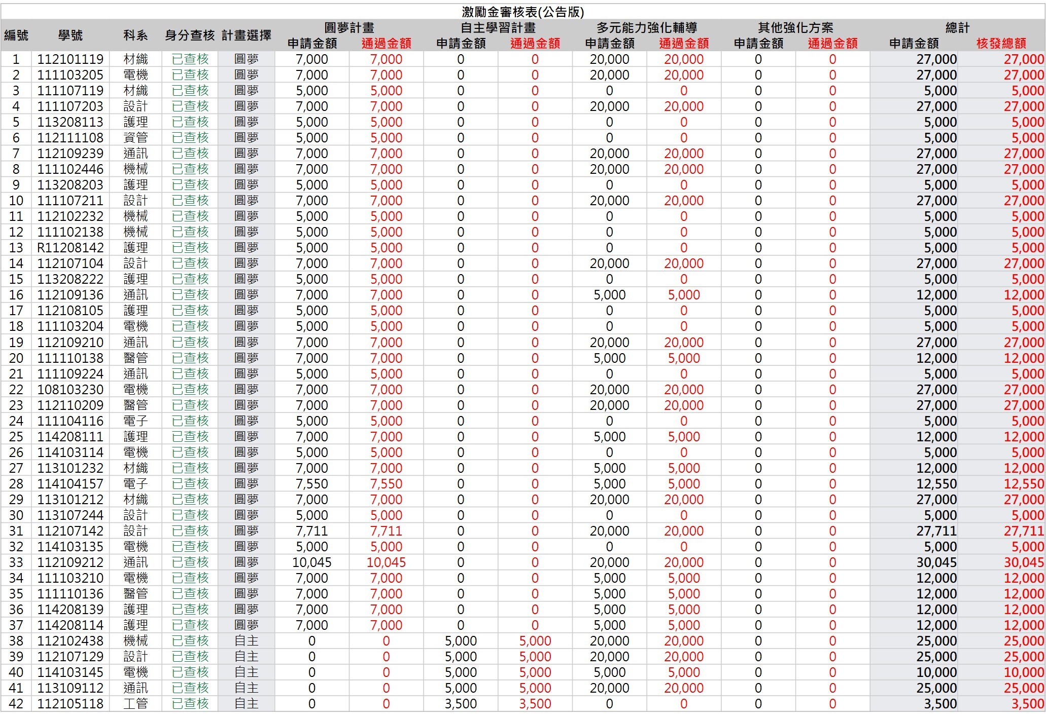 114年完善計畫,10月份學習激勵金通過名單如下表,核發明細詳見公告。