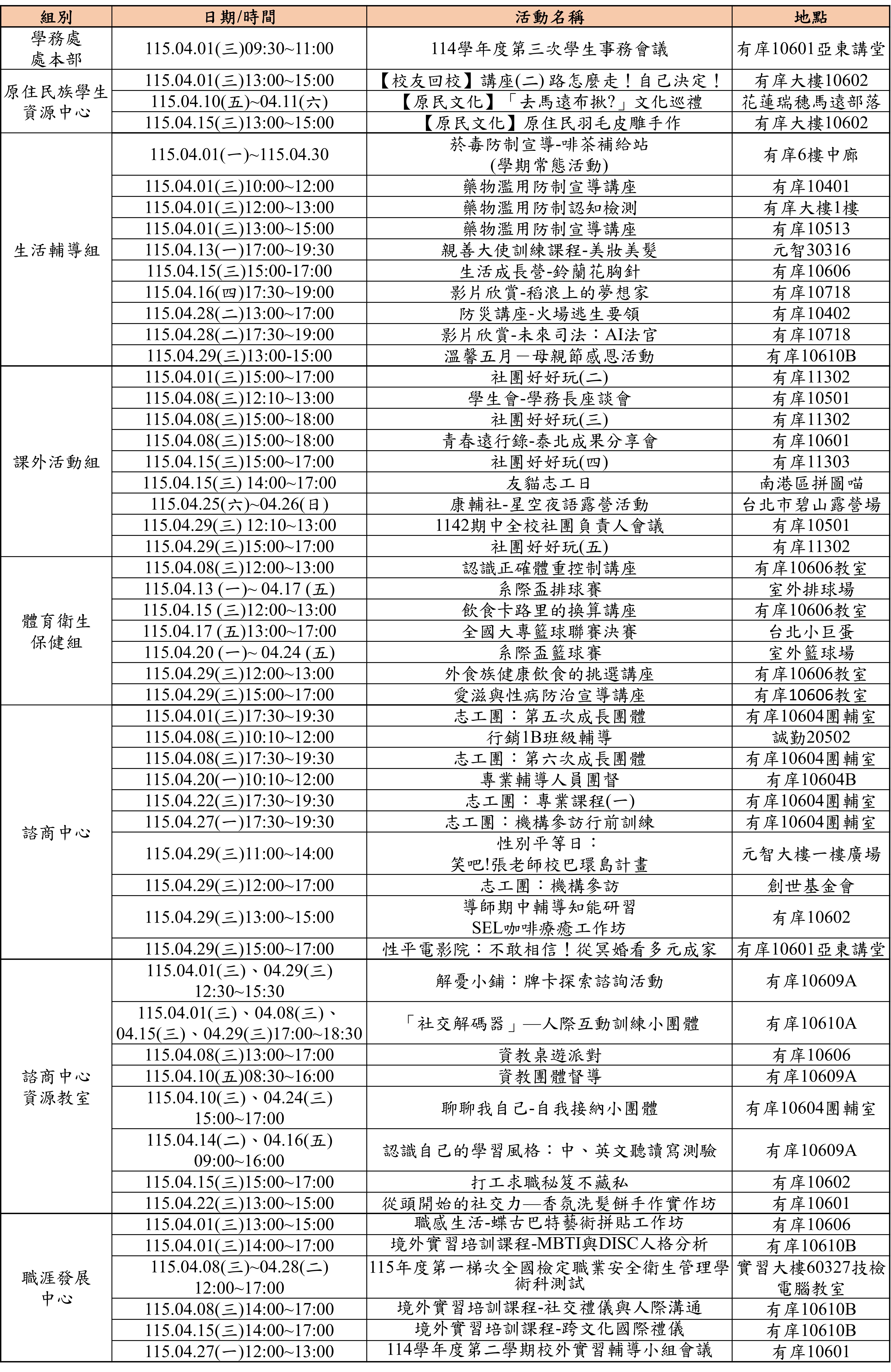 115年4月份學務處活動一覽表